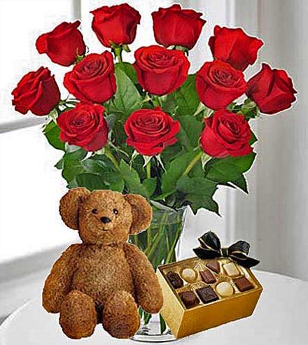 Give your special someone the perfect combination of a dozen red roses and goodies to go with it!