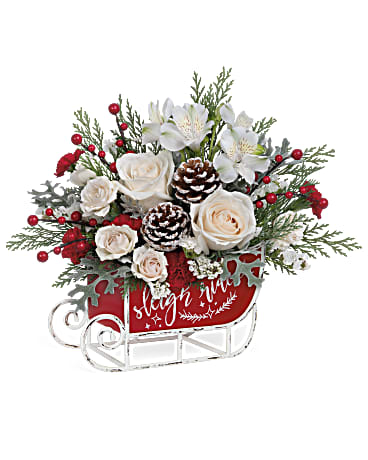 This cute Christmas bouquet of snow white roses and flocked greens becomes an extra special delivery in this whimsical vintage sleigh! Sending flowers for Christmas will bring joy to all this season.