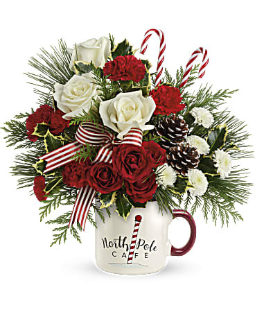 This bouquet includes red spray roses, miniature red carnations, white button spray chrysanthemums, flat cedar, white pine, and variegated holly. Delivered in Teleflora’s Send a Hug® North Pole Café Mug.
