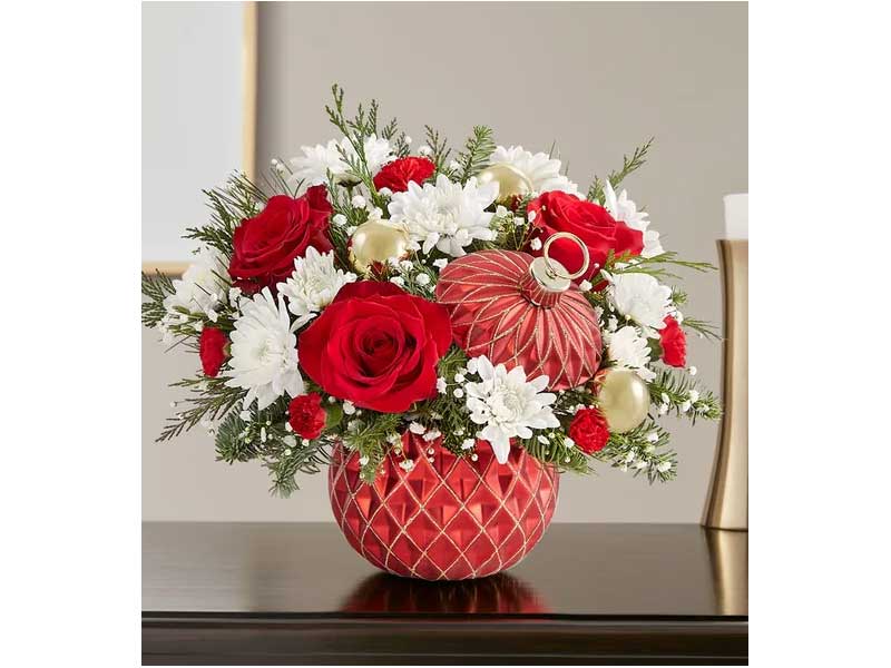 • All-around arrangement with red roses and mini carnations; white cushion poms; accented with baby’s breath, assorted Christmas greenery and decorative gold ornament balls