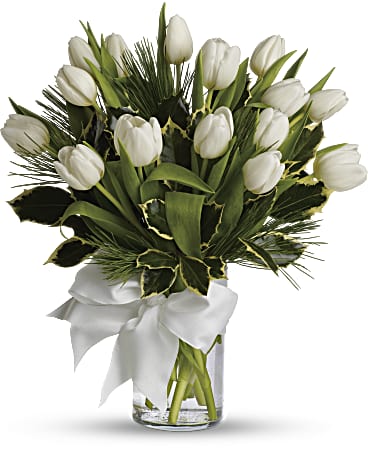 Give a gift of simple winter beauty. Send a bouquet of white tulips that are as pure as fresh-fallen snow, accented with just a touch of fragrant white pine. It’s the essence of the season, captured in a vase.